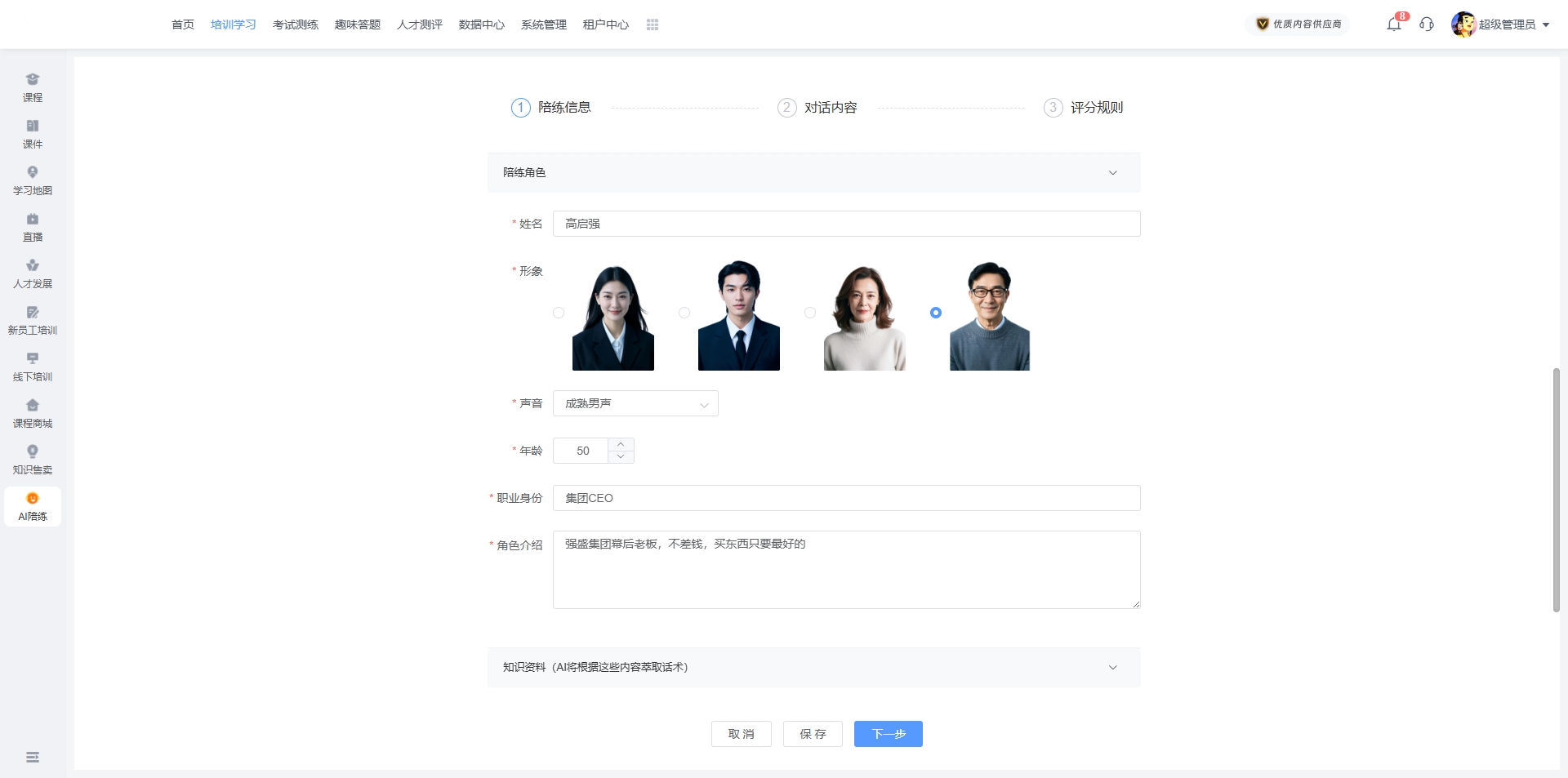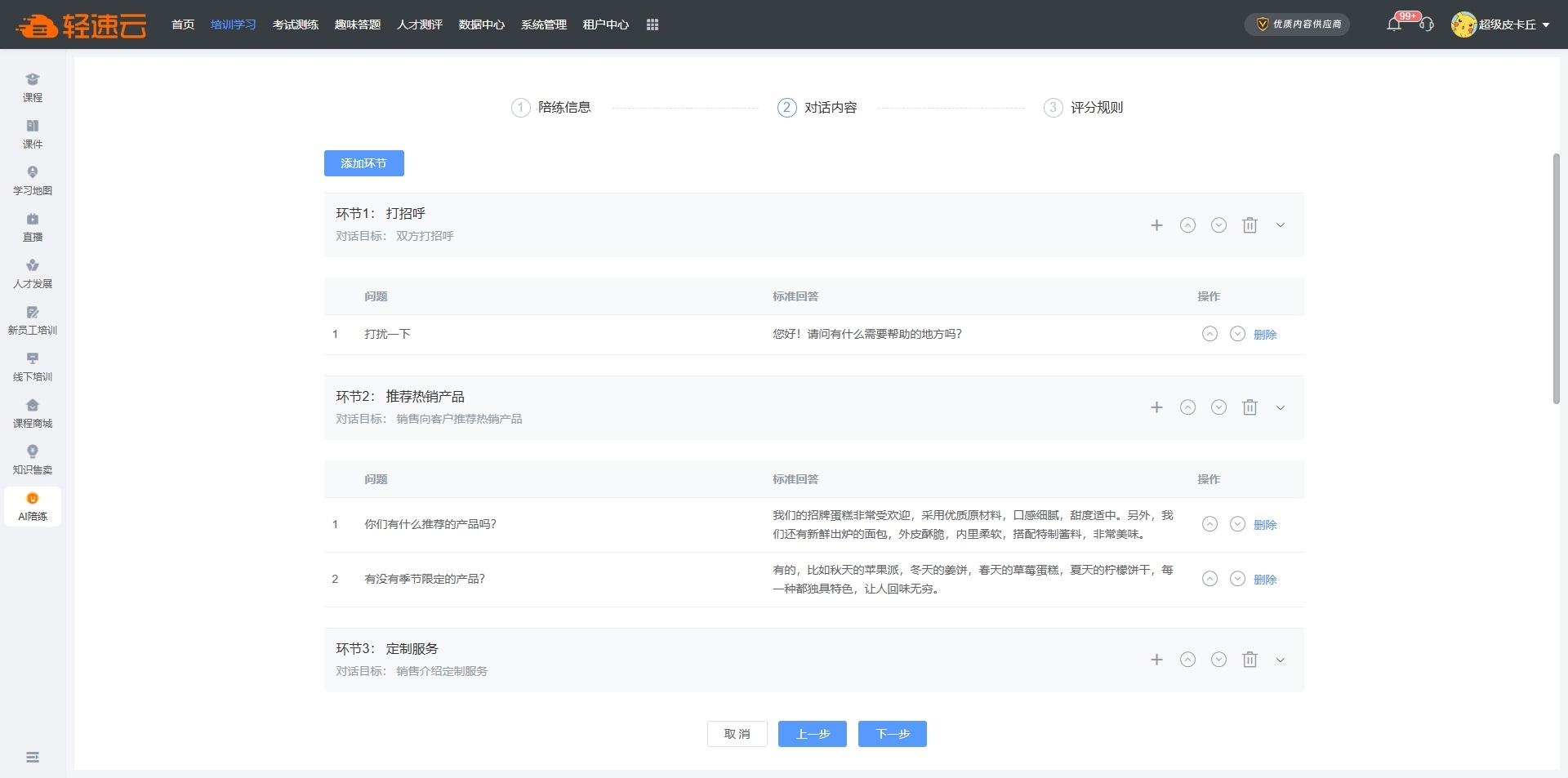 AI陪练是模拟实际沟通交流场景而开放的情景对话练习功能,管理员可以设置一些练习场景,由AI模拟顾客来向学员发出提问,学员通过不断的练习后以便能够更好的实际接待真实顾客。