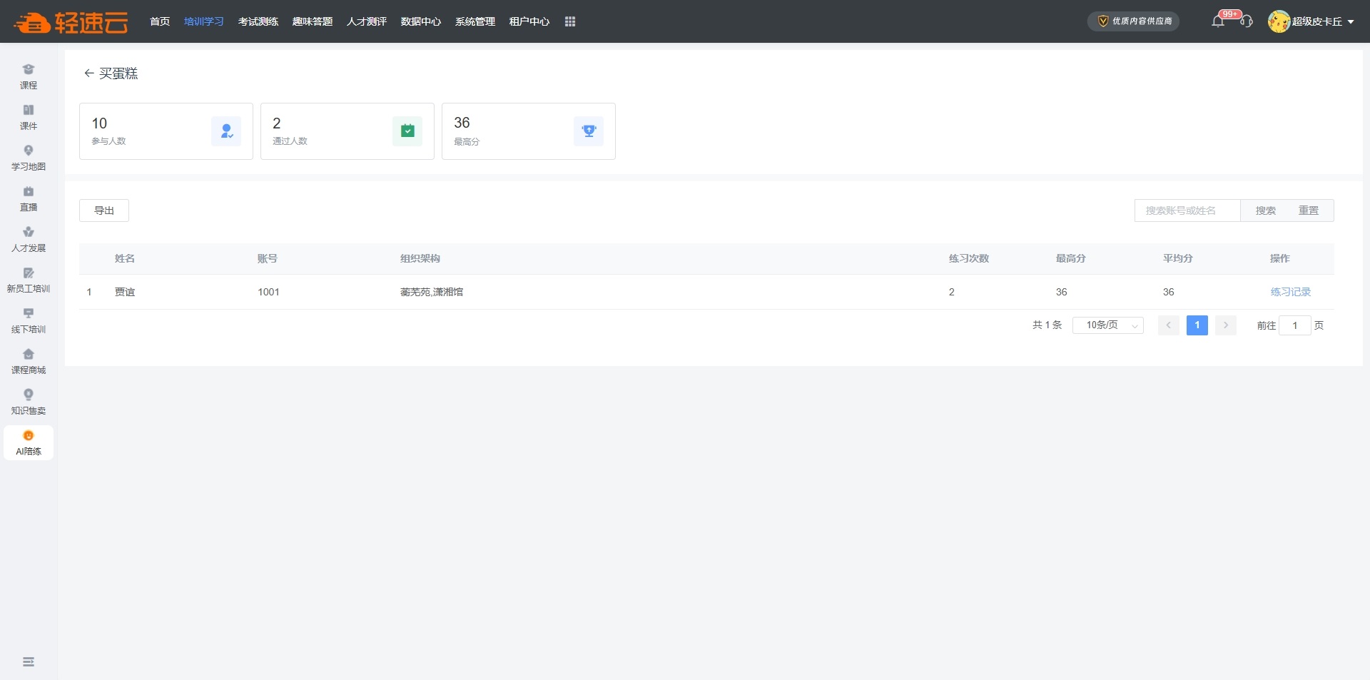 列表中会展示学员的练习次数、得分等信息,点击 练习记录 还能进一步查看对应练习的详情。