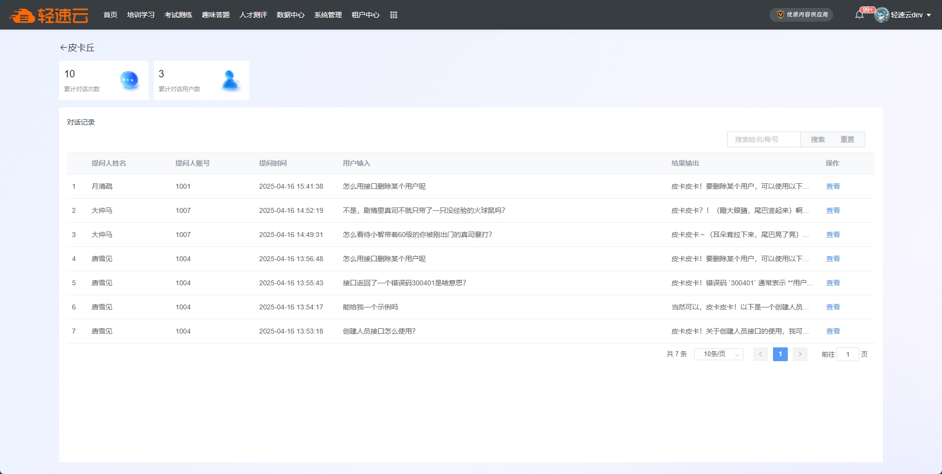 管理端会记录学员与知识库的对话情况,点击 分析 ,能够查看相应的对话信息。