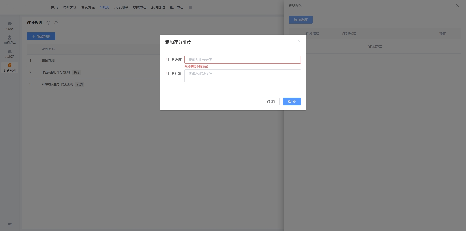 通过 AI能力 - 评分规则 入口能够设置AI评分规则,目前该规则主要应用于AI陪练打分以及作业打分。AI会根据预设的评分维度对学员的学习情况进行评价打分。