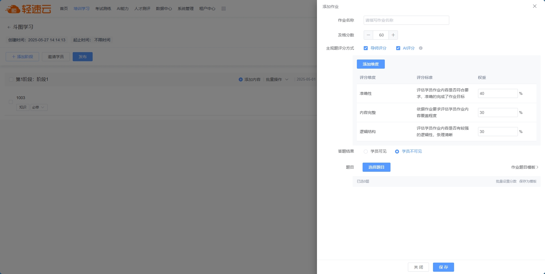 在 学习地图 或 kaiyun官方官网 中能够添加作业任务,启用AI评分后,AI会根据预设的判分条件对学员的作业进行打分。
