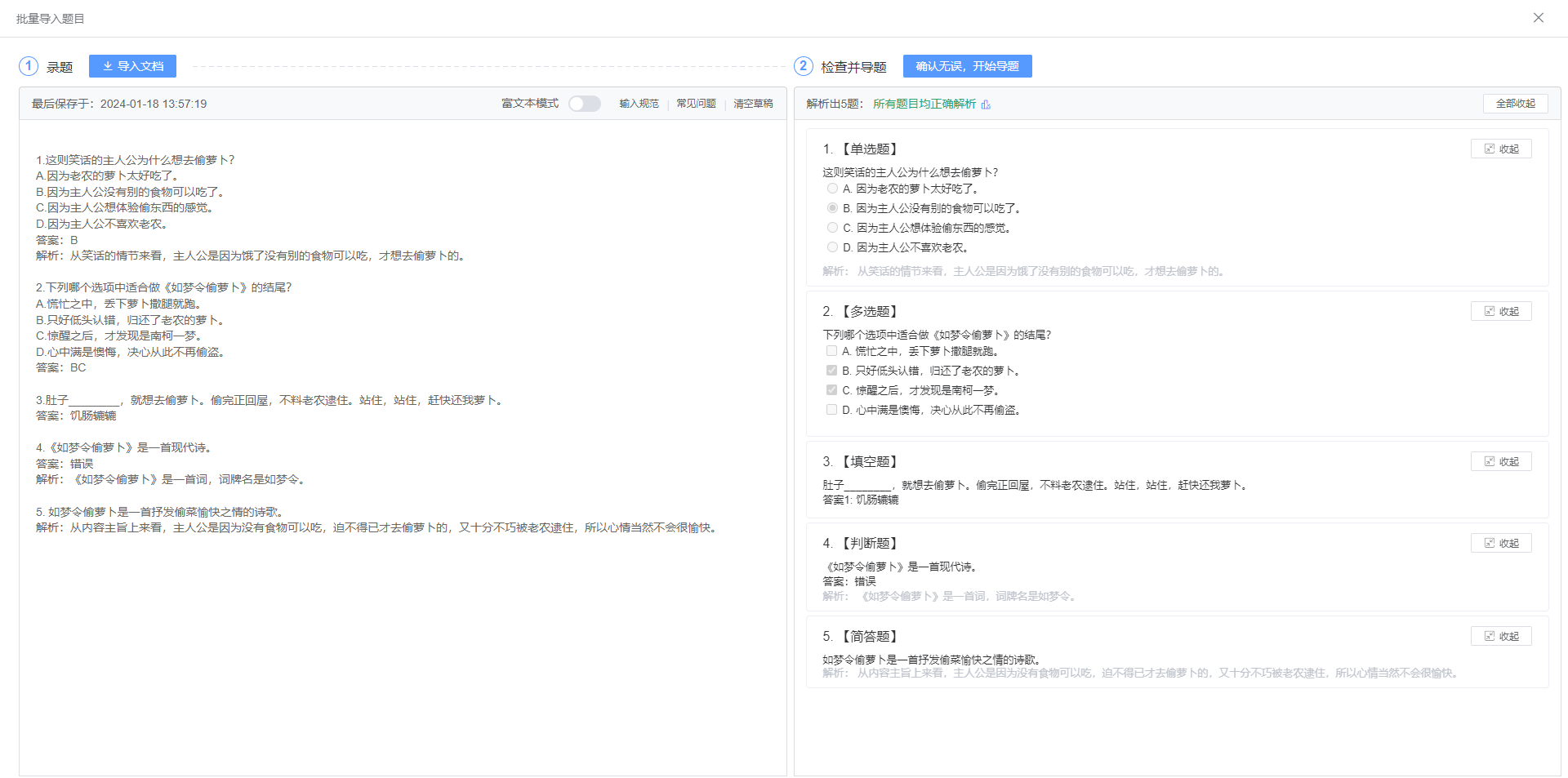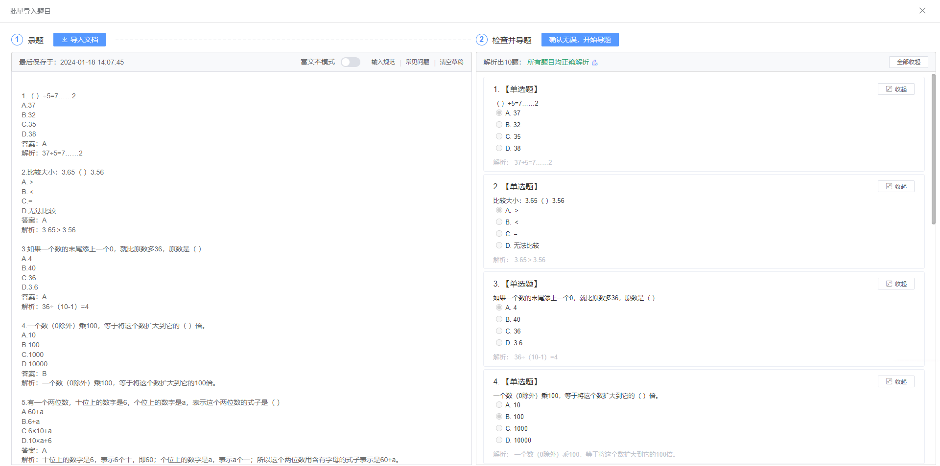 查看题目后会进入批量导题页面,管理员可逐一检查AI生成的题目,判断是否需要删减或修改。确认无误后,即可将已生成的题目导入到题库中。