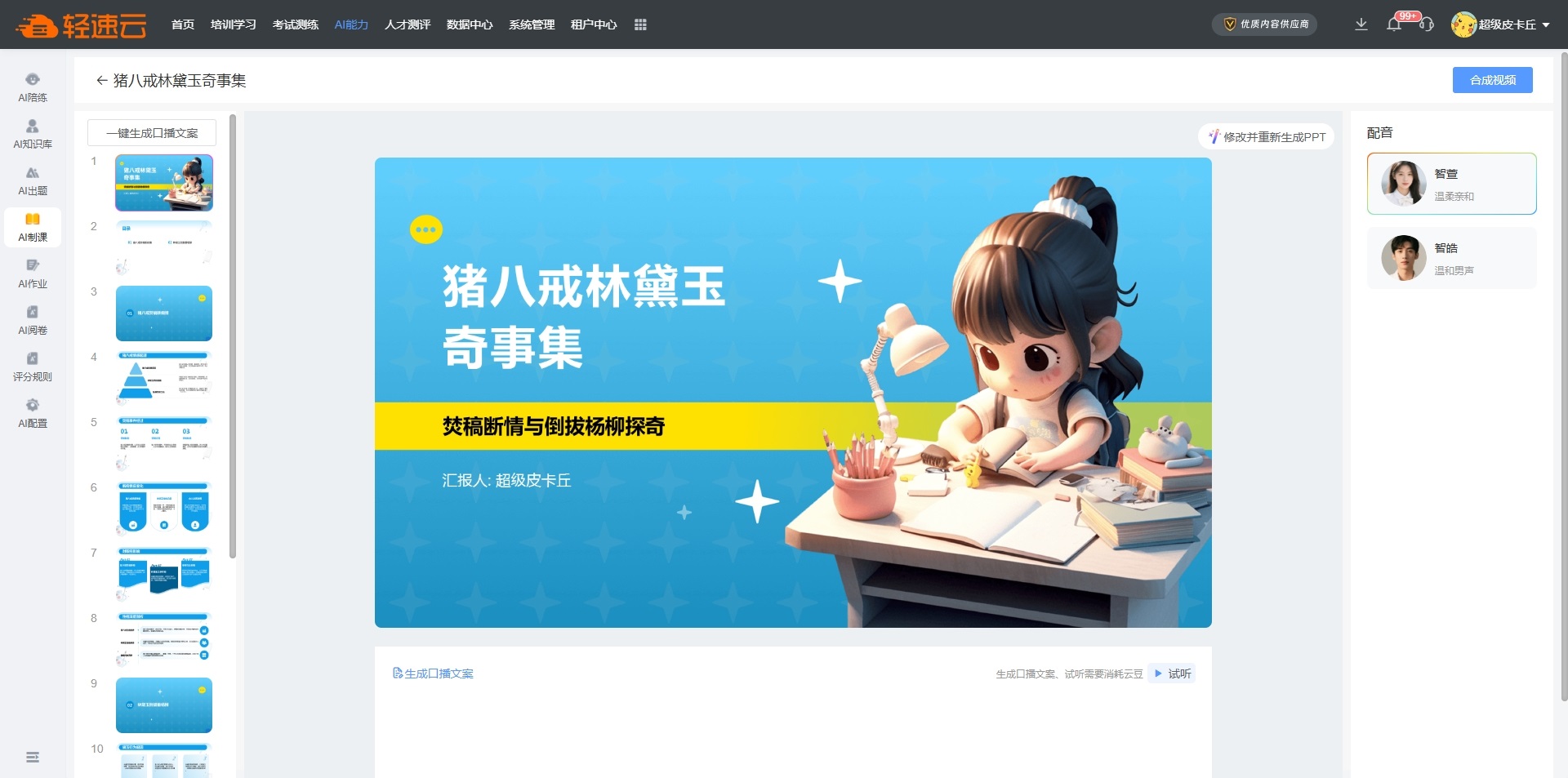 所有的ppt都已经保存口播文案后,选择一名配音助手,点击 合成视频 ,AI会开始进行视频生成动作。