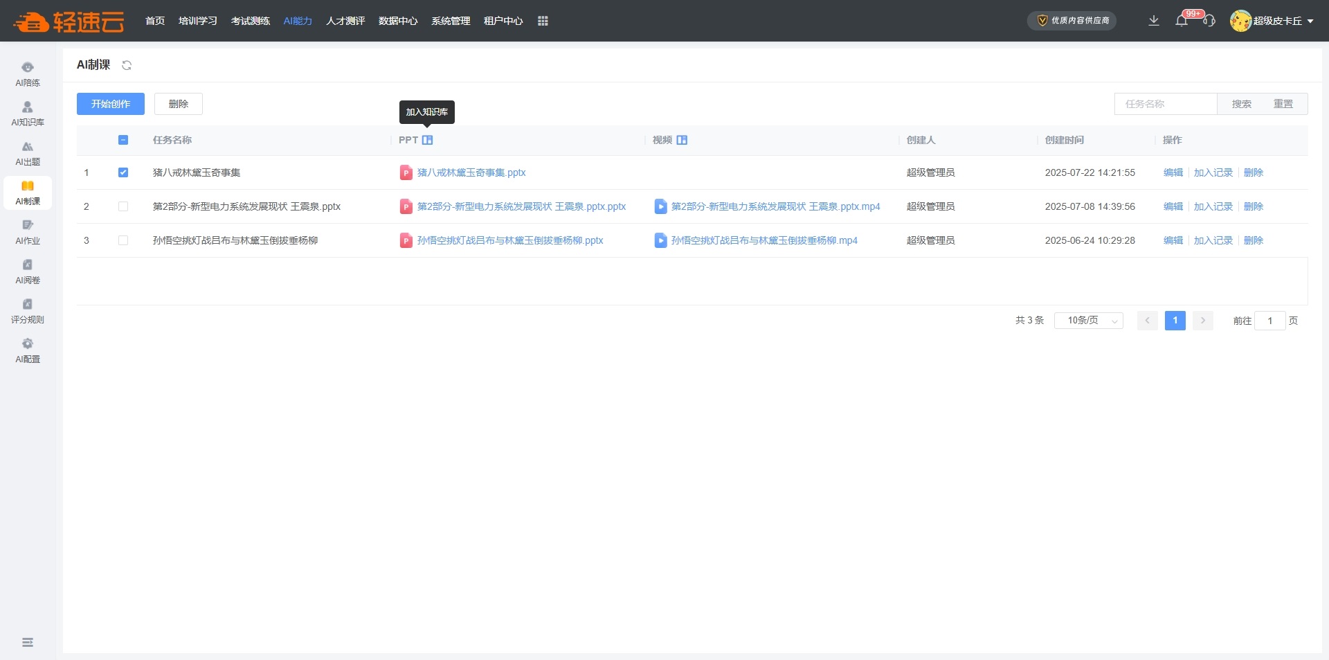 在 AI制课 列表,勾选需要添加到知识库的内容,然后点击 加入知识库 按钮,即可将对应内容添加到知识库中。