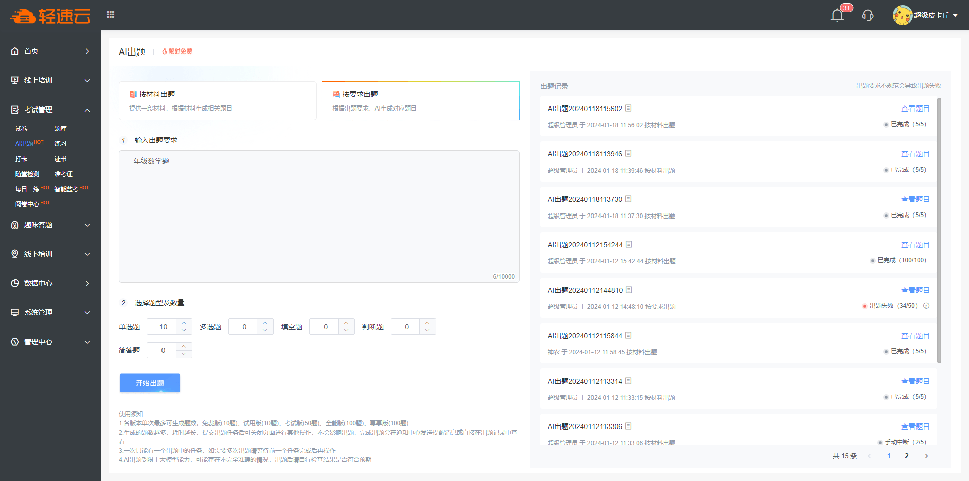 点击管理端左侧 AI出题 菜单,即可进入出题页面。
