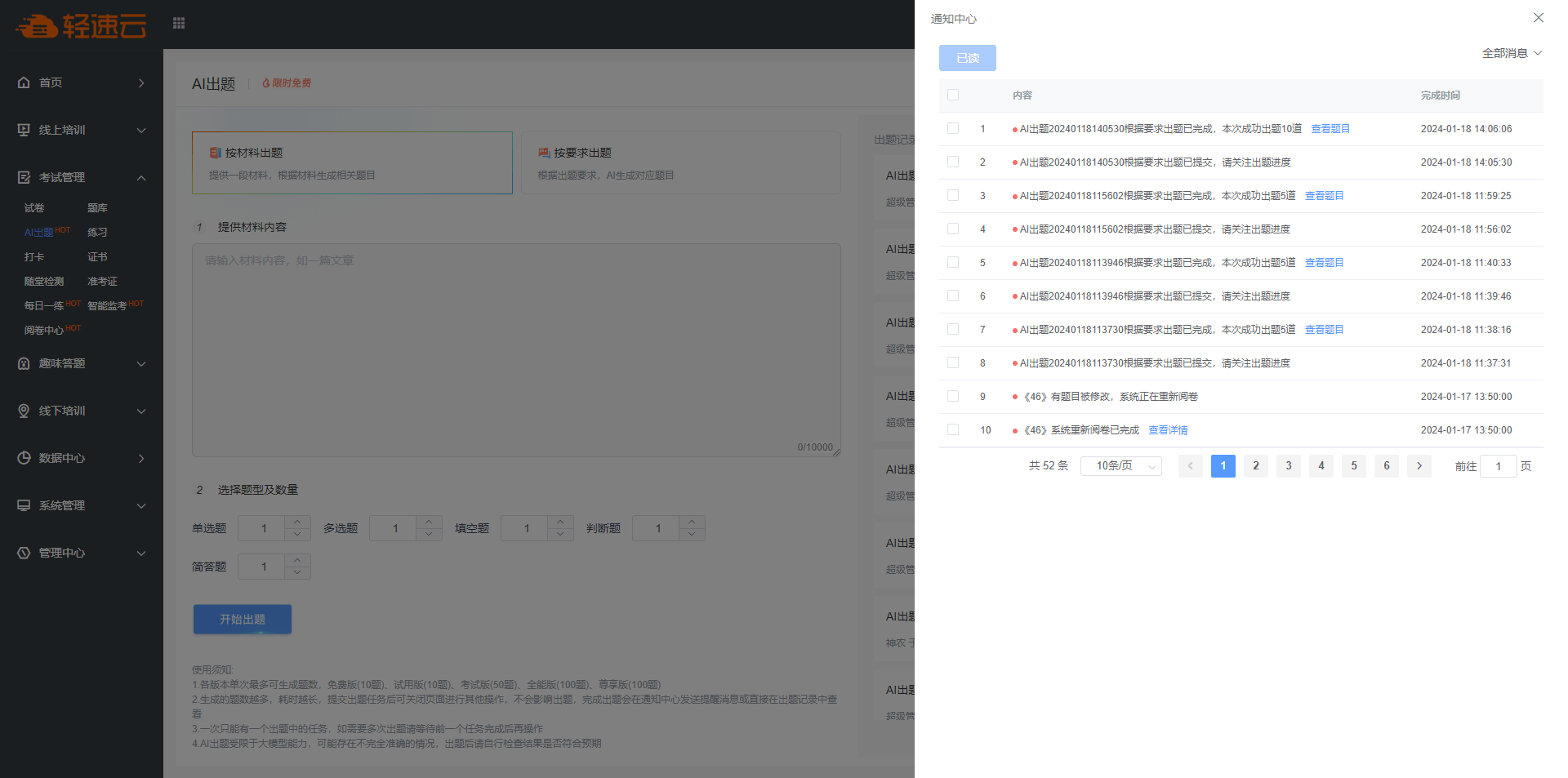 AI生成题目需要一段时间,请耐心等待。题目生成完毕后,系统会通过右上角的 通知中心 推送消息。