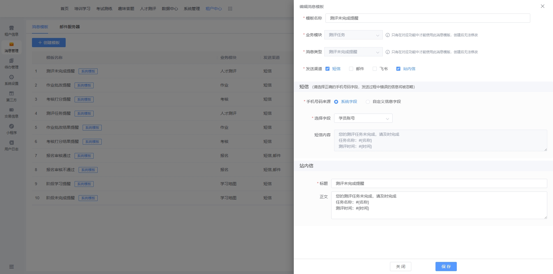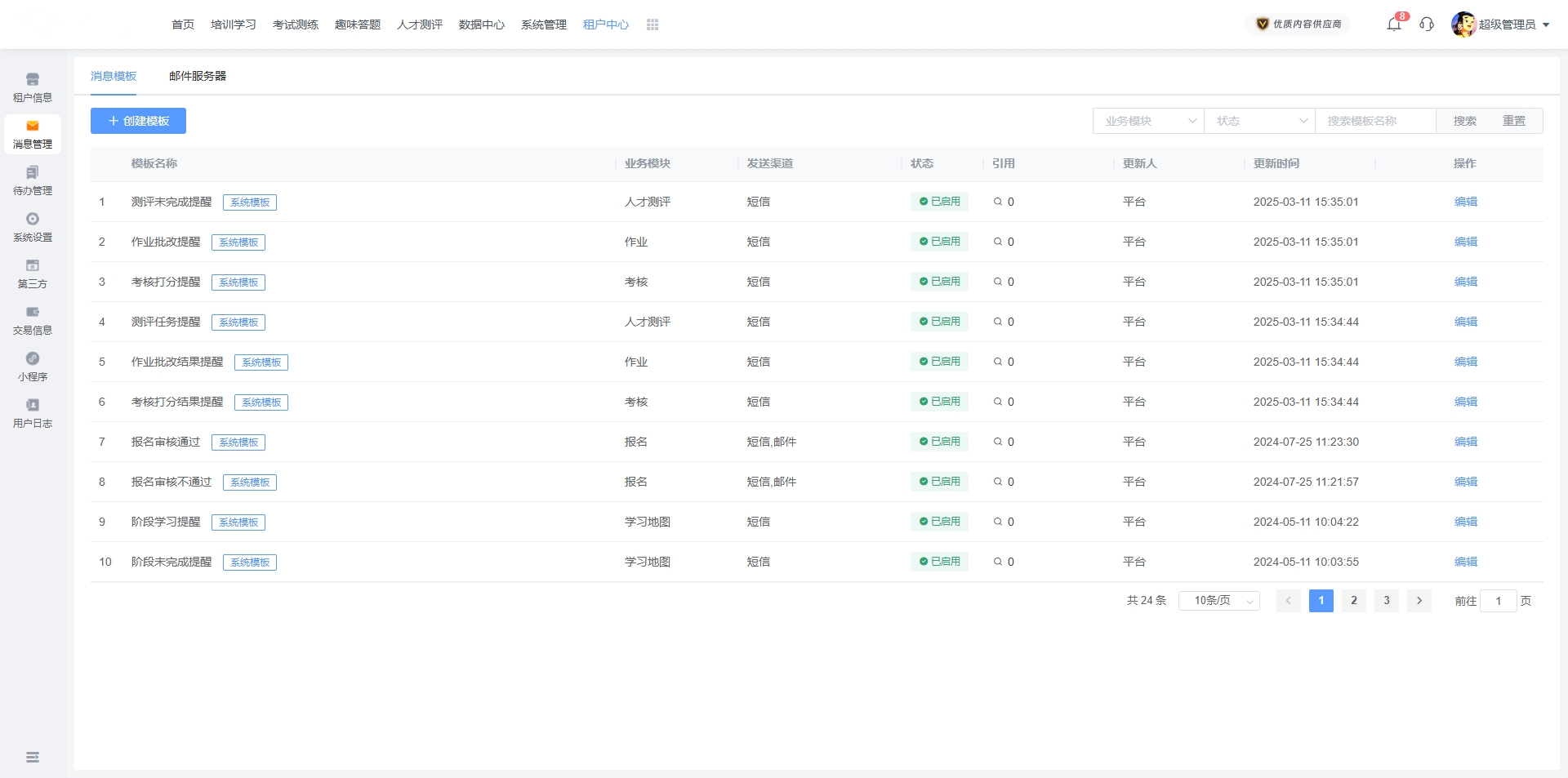 针对不同的功能模块,系统均提供默认的基础模版,也可根据实际使用需求创建或编辑新的消息模版。默认模版无法被删除。