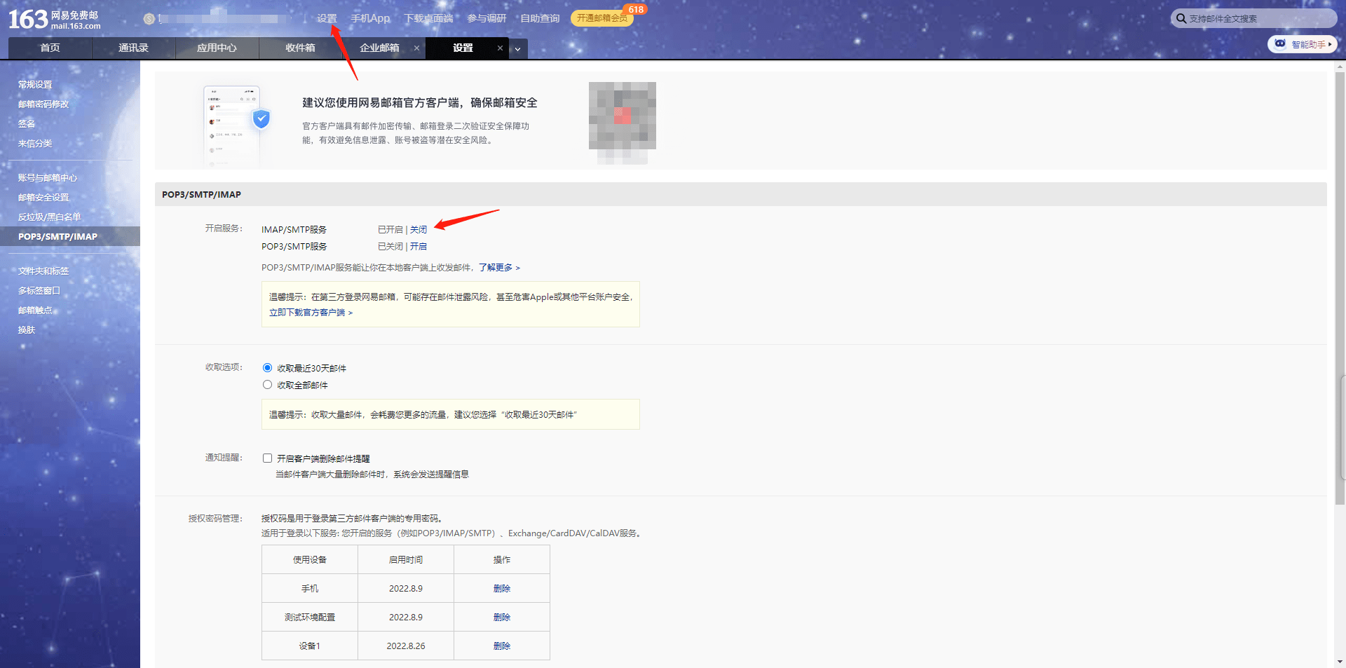 登录到邮箱,点击顶部 设置 按钮,然后启用 IMAP/SMTP服务 。