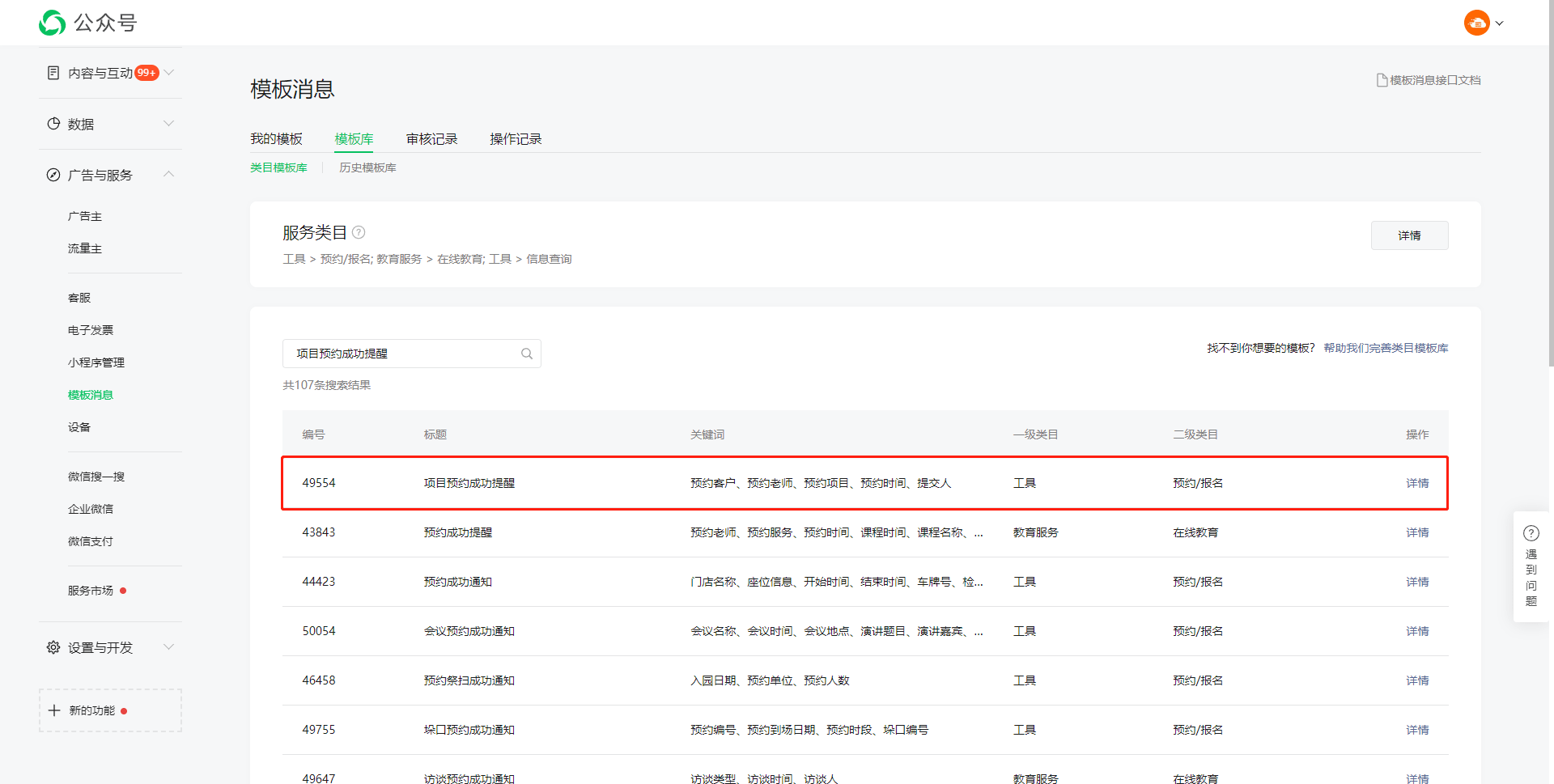 搜索模版名称 项目预约成功提醒 ,然后添加编号为 49554 的消息模版,点击 详情 。