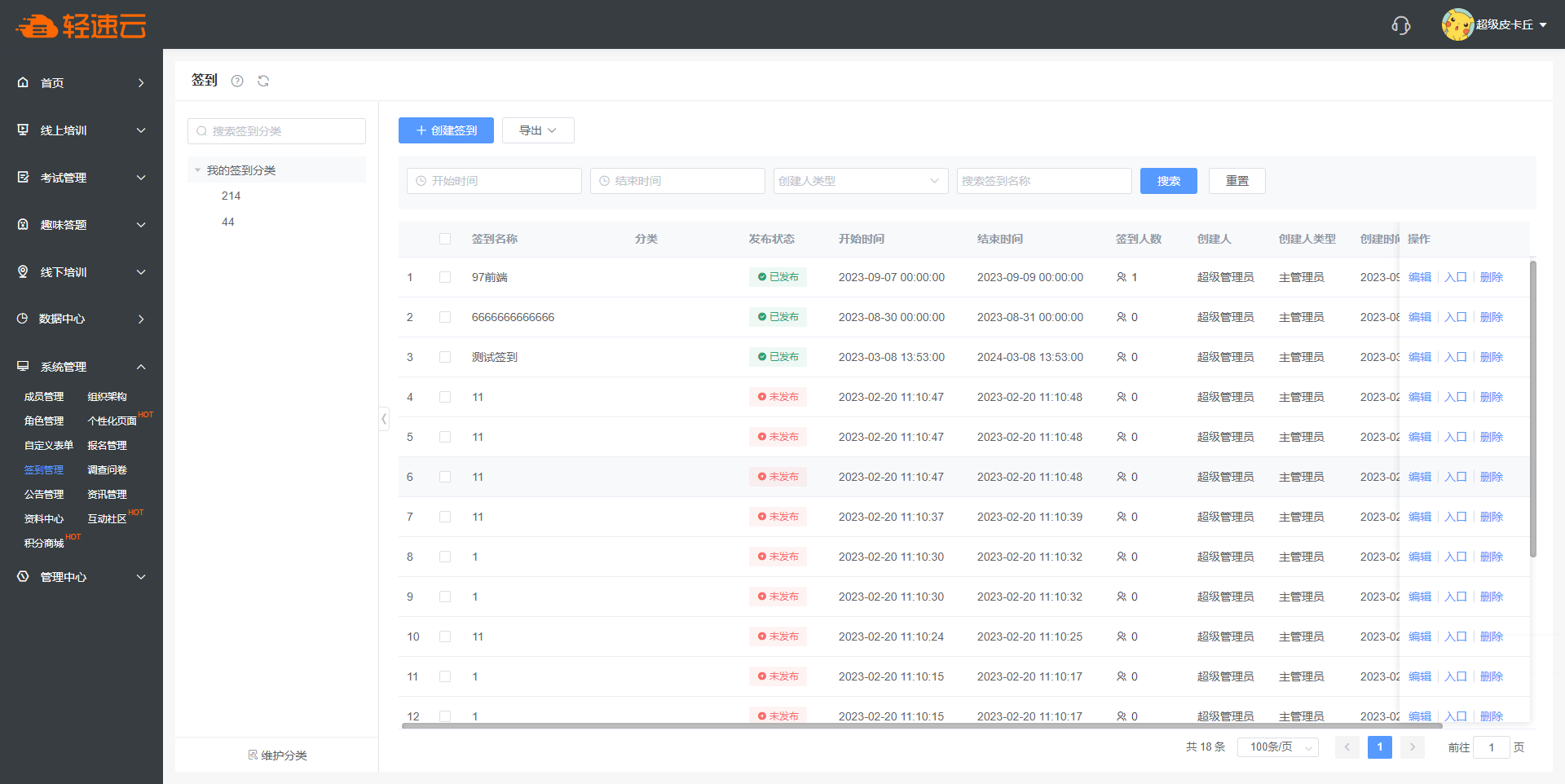 登录到管理端后台,点击左侧 签到管理 菜单,可以进行签到的相关操作。已创建的签到会在列表中展示。