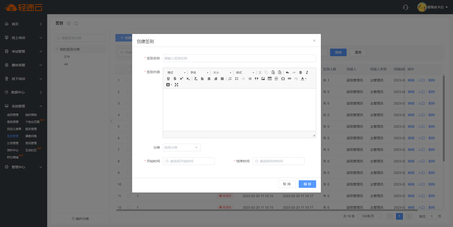 点击左上角 创建签到 按钮,填写基本信息,即可新增一个签到。
