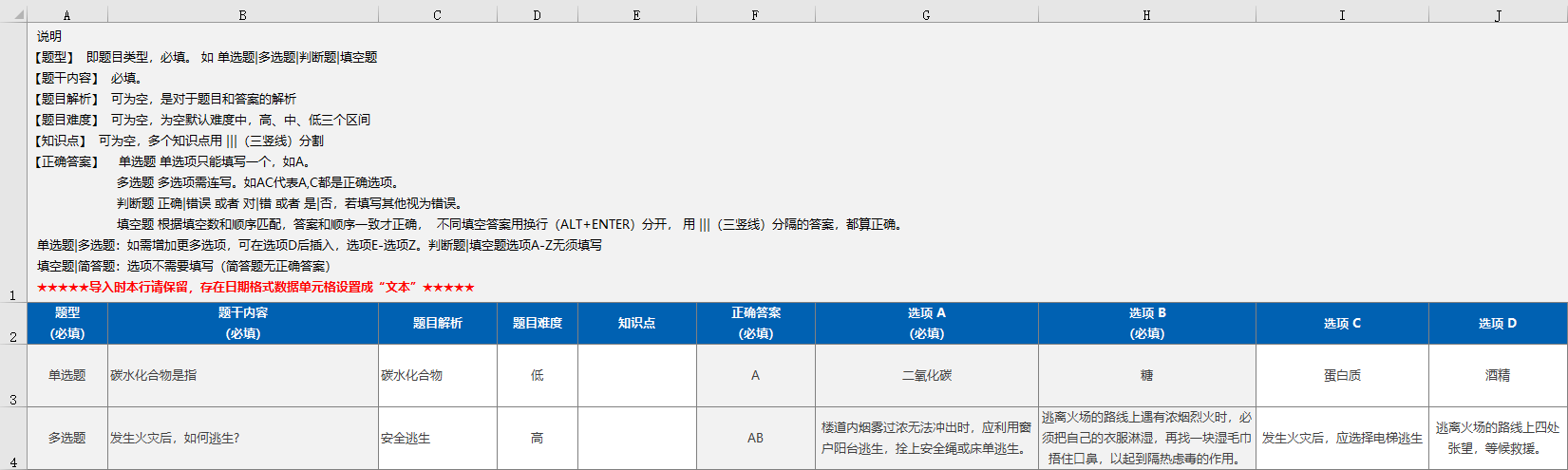 以Excel的方式导入时,必须项目有 题型 、 题干 、 答案 ,对于单选题和多选题来说, 选项 也是必须的。