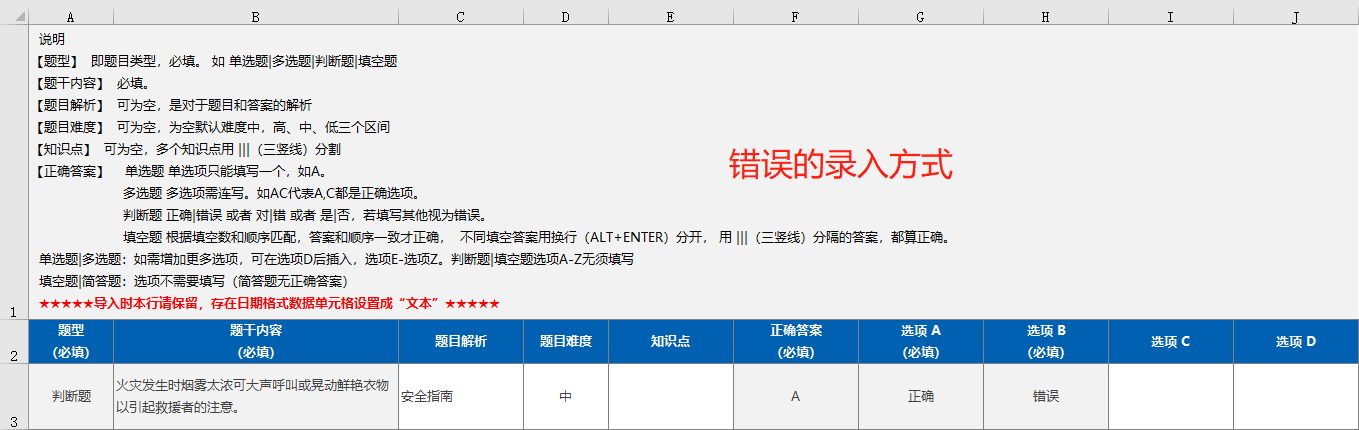 请通过系统页面直接下载Excel文档模版,并在此基础上增加题目信息。否则可能因为某些单元格格式不符而无法导入。您不能删除模版文件中的首行标识信息。