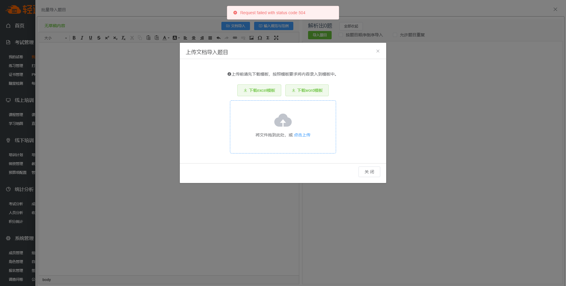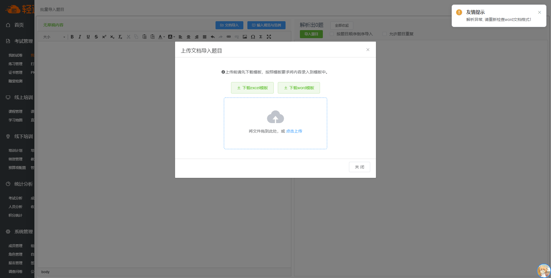 请尽量清除文档中的所有格式(例如文字加粗、颜色、单元格边框等)再进行导入,若文档中题目较多,建议您分多次导入。