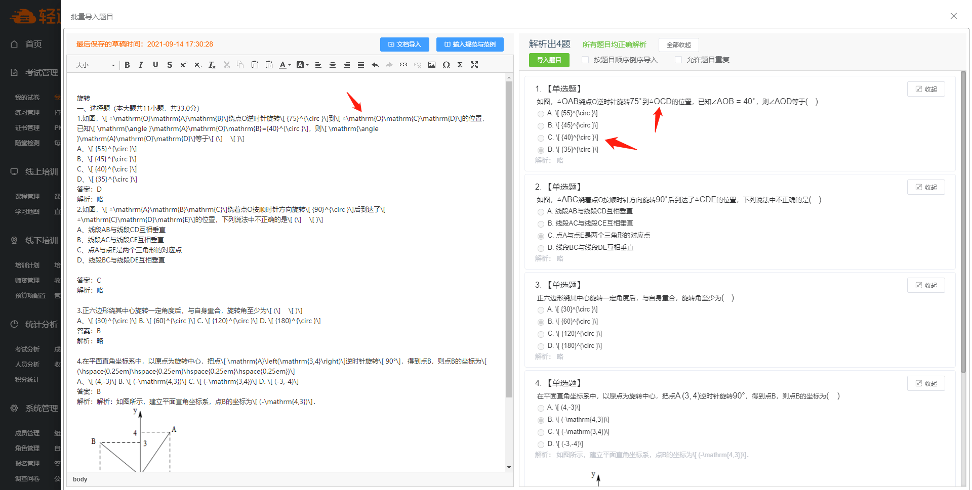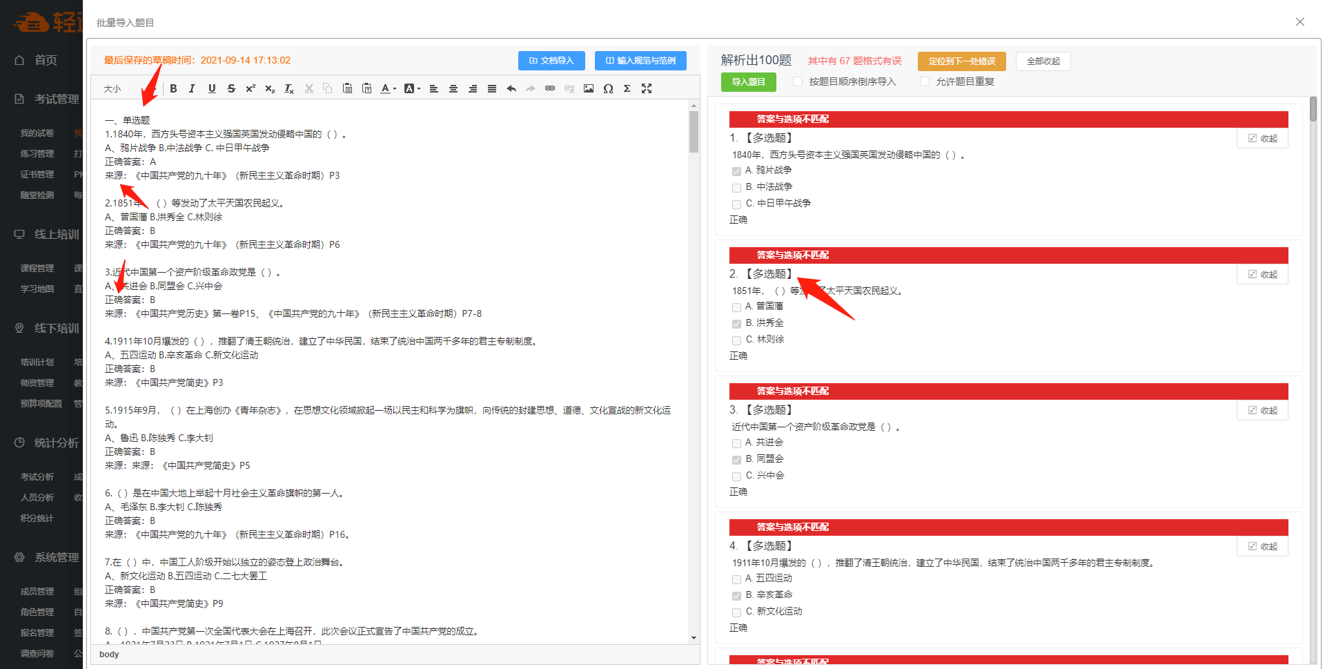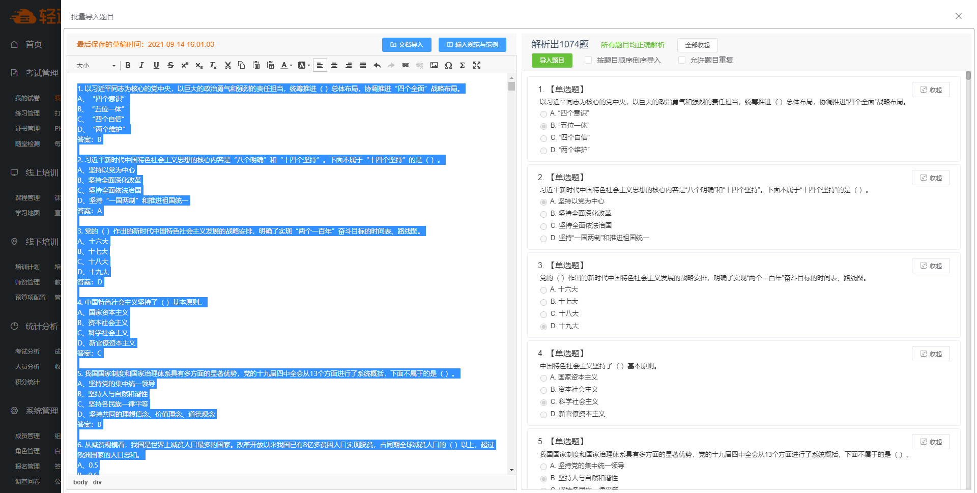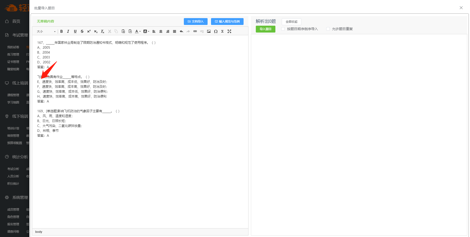 您可以使用 复制/粘贴 的动作将文本内容复制到批量导题功能的识别区,系统会自动开始解析。