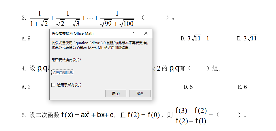 点击 是 ,则word会将此公式转为受支持的新版公式。建议您勾选 适用于所有公式 ,再点击 是 来转换当前文档中的所有旧版公式。