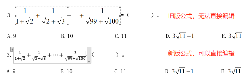 答:请您确保您当前使用的word版本为word2019或更高版本(wps无法进行此操作),打开某个文件后,新版与旧版公式在页面上的差异如下图所示。