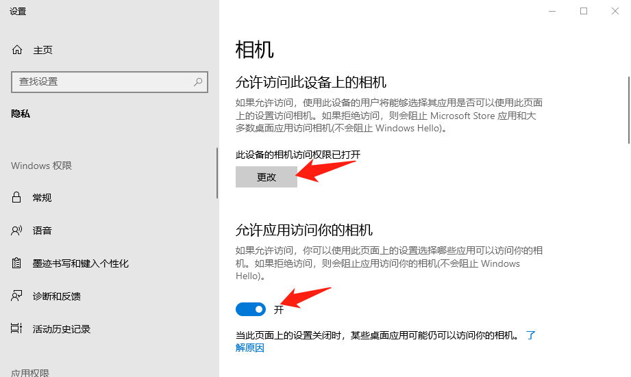 3、开启 此设备的相机访问权限 、 允许应用访问你的相机 、 允许桌面应用访问您的相机 。