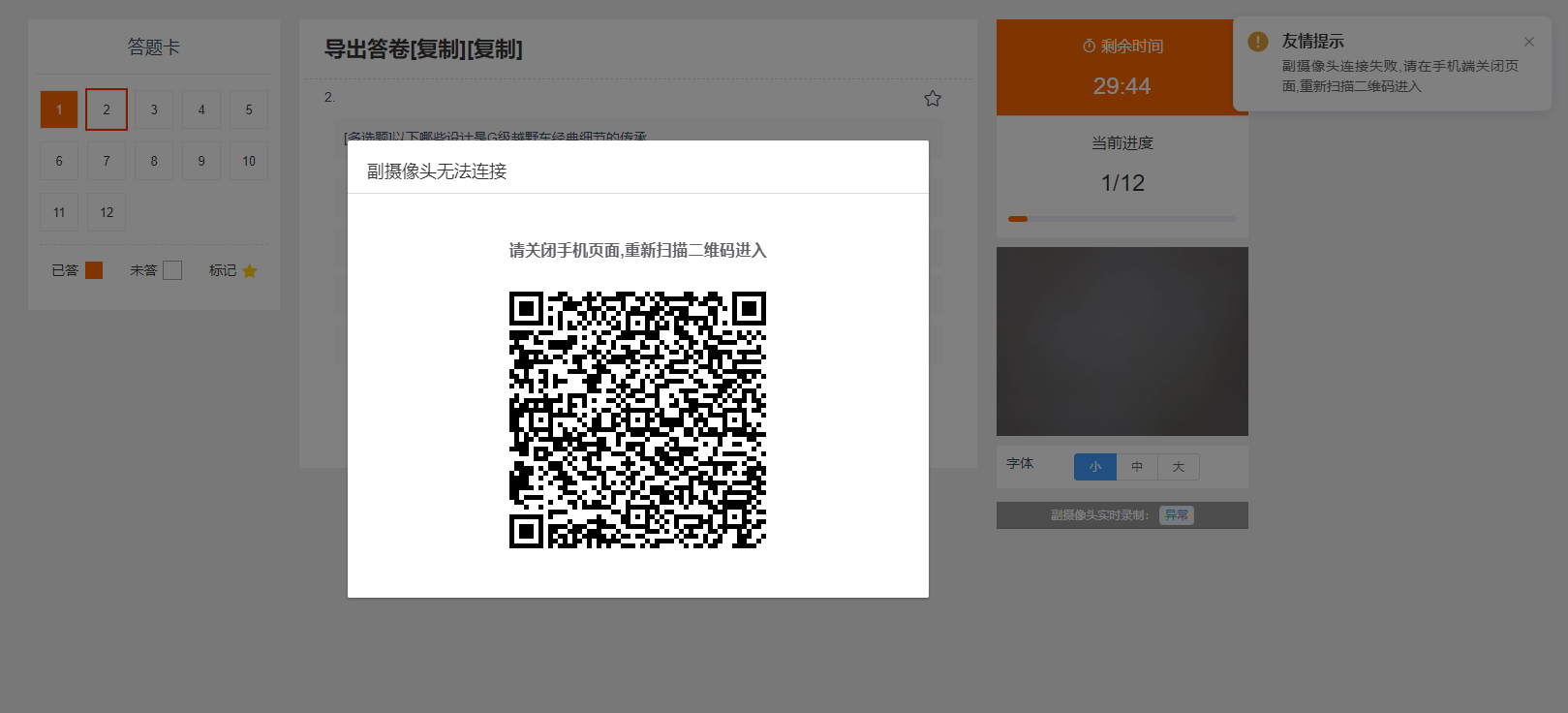问题:副摄像头无法连接,请关闭手机页面,重新扫描二维码进入。