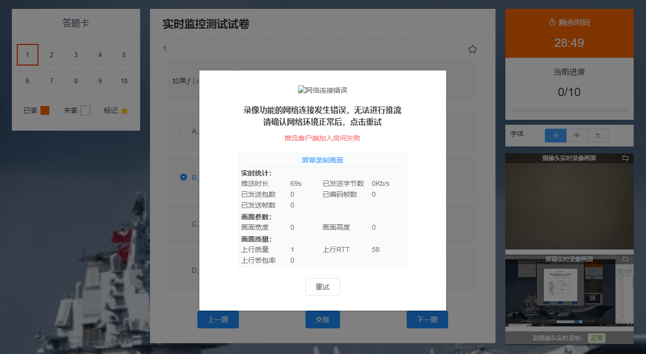 答:网络条件不稳定或存在明显波动(如网络差、更换网络、考试软件被限速等),请检查网络情况。一般情况下网络恢复时该窗口会自动关闭,也可以确认网络无问题时点击 重试 按钮关闭弹窗。