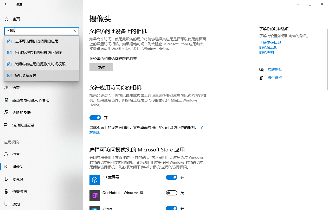 在windows设置中搜索 相机隐私设置 ,将摄像头权限全部开启。